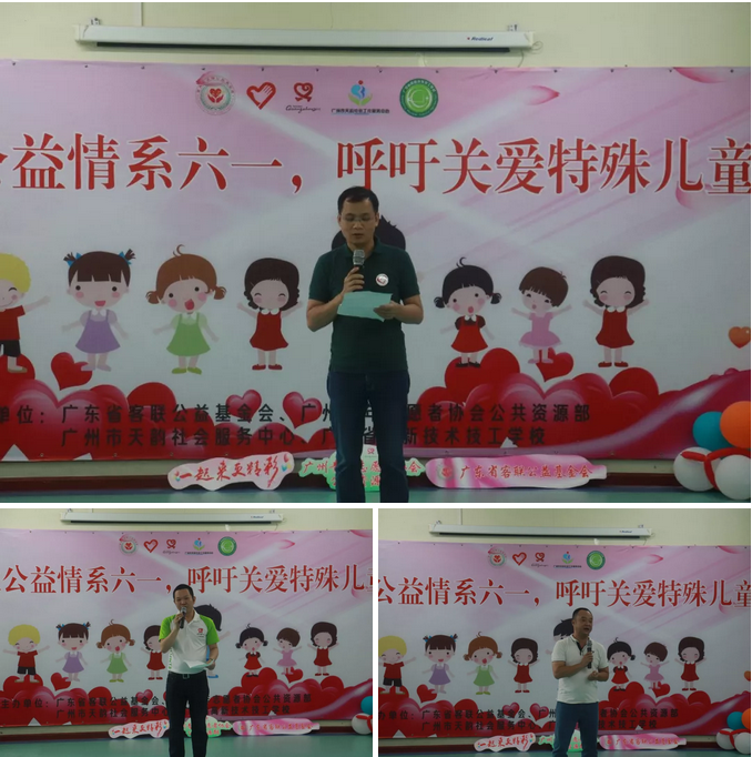 活動(dòng)首先由主辦單位廣東省客聯(lián)公益基金會(huì)鄧爭明理事長、廣州市青年志愿者協(xié)會(huì)張軍文和協(xié)辦單位廣州天韻社會(huì)服務(wù)中心鄒雷理事長講話,向“廣州市天韻社會(huì)服務(wù)中心”的小朋友們和辛勤勞動(dòng)的老師們表示真摯的節(jié)日問候。