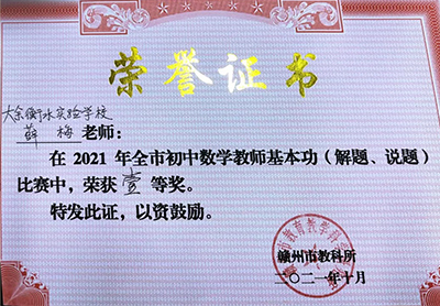 在剛落下帷幕的2021年贛州市初中數(shù)學(xué)青年教師基本功暨“解題·說(shuō)題”比賽中,我校薛梅老師榮獲全市...
