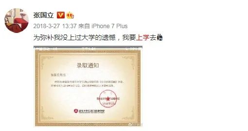 前年,64歲的演員張國立憑借自己的努力,自學(xué)考生,成功考上清華大學(xué)五道口金融學(xué)院,在收到錄取通知書后,第一時間在微博上分享了自己的喜悅,并配文“為彌補(bǔ)我沒上過大學(xué)的遺憾,我要上學(xué)去”。