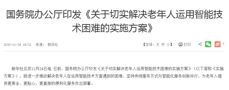 11月24日,國務院辦公廳印發(fā)了《關于切實解決老年人運用智能技術(shù)困難實施方案》的通知,要求各類日常生活場景中,必須保留老年人熟悉的傳統(tǒng)服務方式。