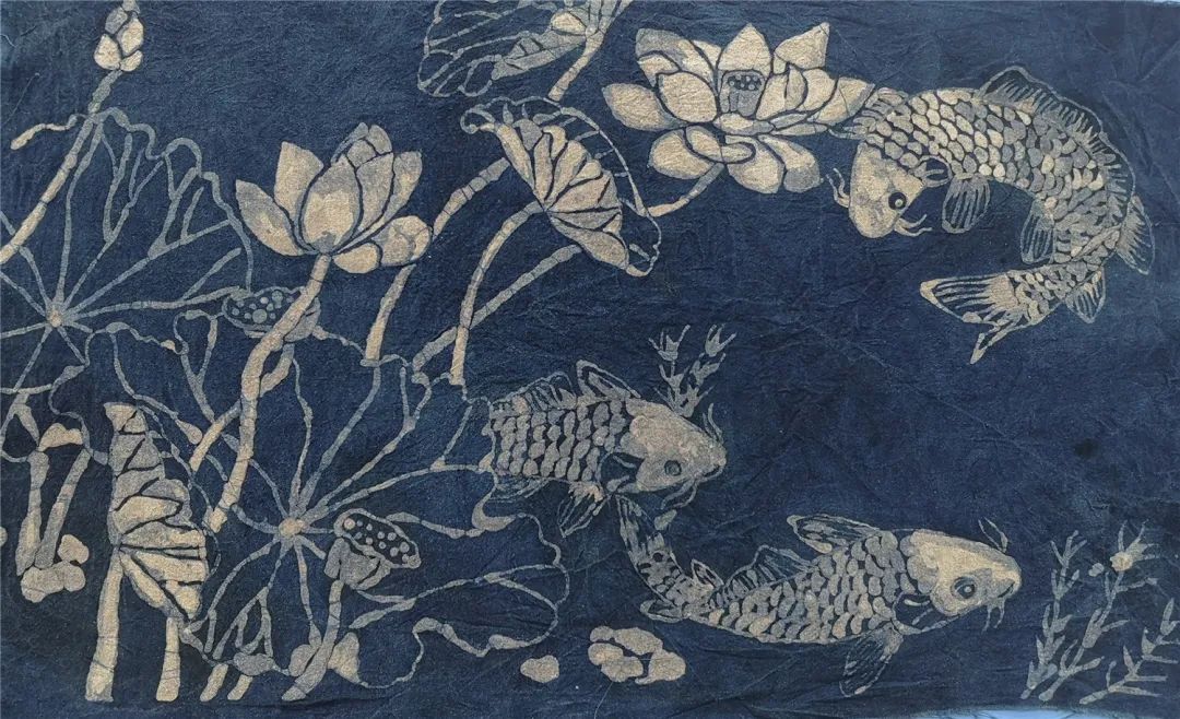 蠟染是用蠟刀蘸熔蠟繪花于布后以藍(lán)靛浸染,既染去蠟,布面就呈現(xiàn)出藍(lán)底白花或白底藍(lán)花的多種圖案。