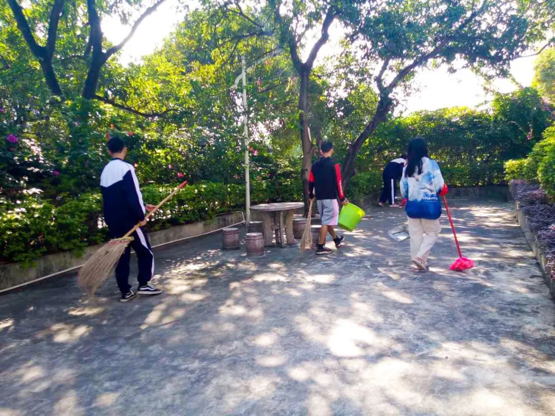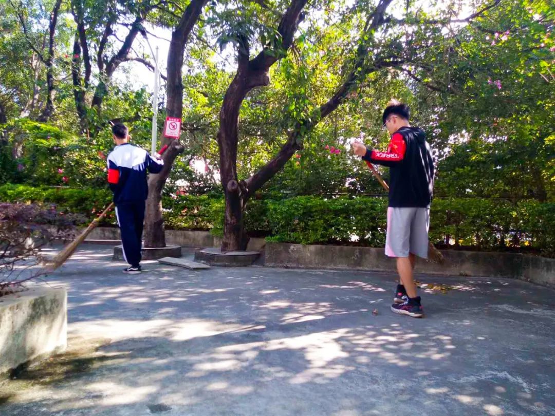 清晨,志愿者在陽光下打掃校園