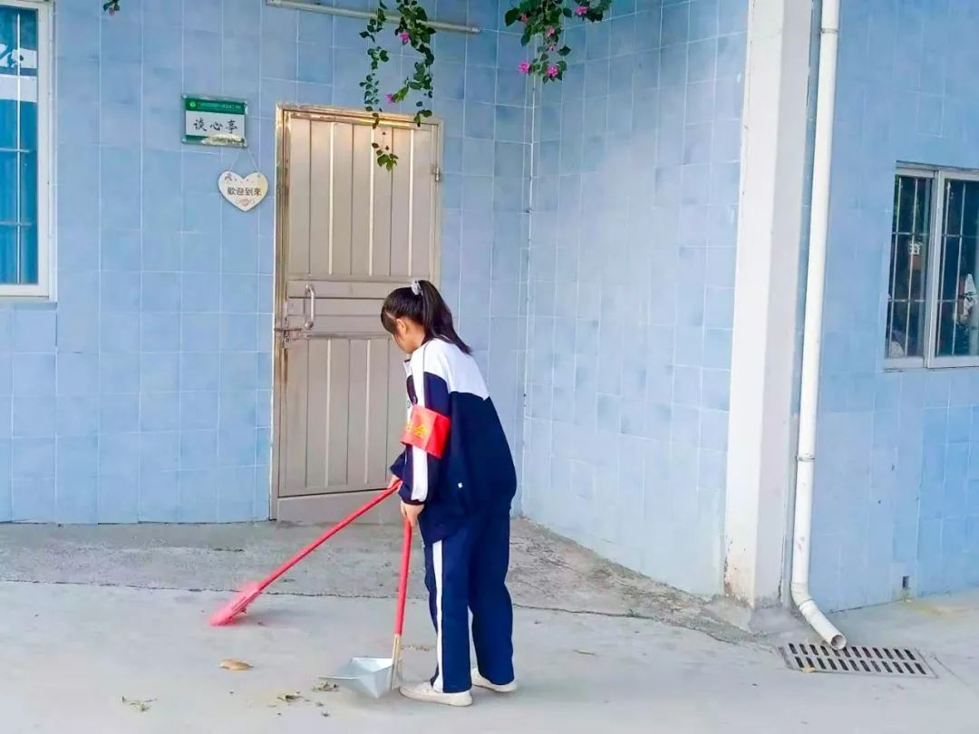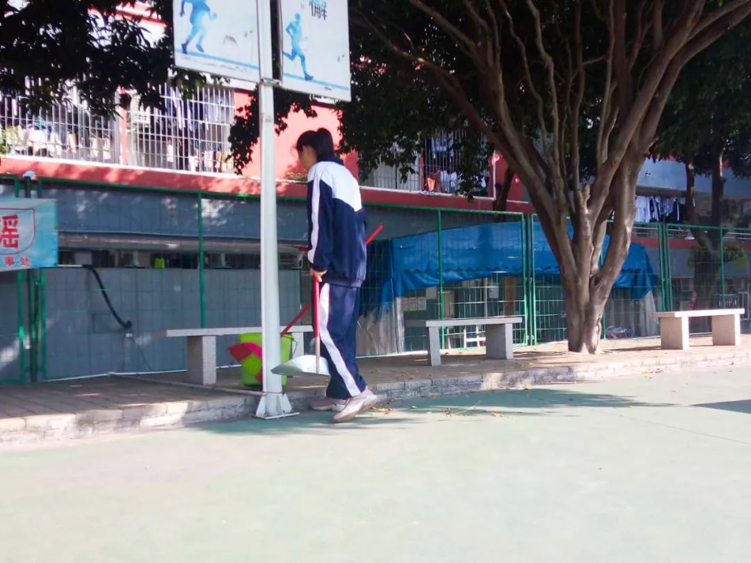 提前到達(dá)操場的是王廷榮、黃詩文、李仁懷、李燦彬、溫善媛等同學(xué)。他們揮動著掃把便開始“沙沙”地清掃落葉,掃地的聲音好像鳥兒在對他們唱歌,又像是在鼓勵他們:“勞動的孩子最美麗”。